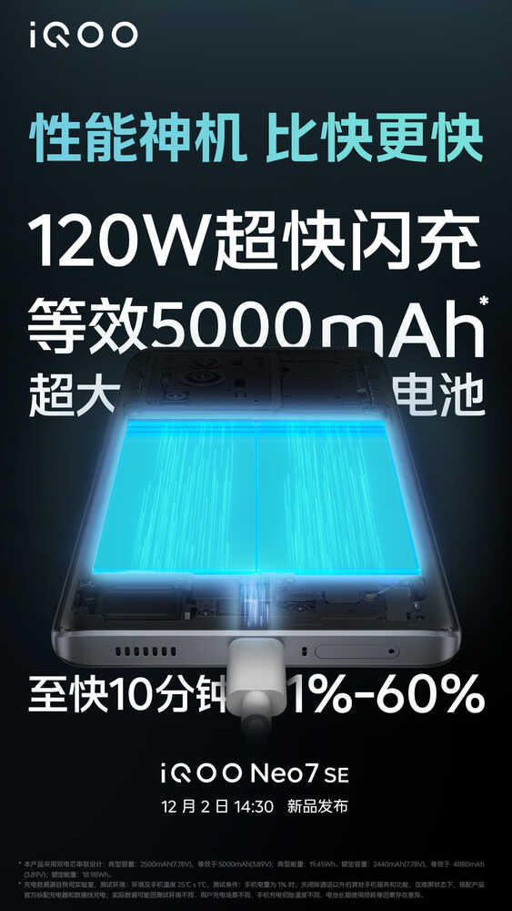 快充和性能作为iQOO手机的两大王牌配置,iQOO Neo7 SE自然也没有落下快充配置,根据官方数据,iQOO Neo7 SE将搭载120W超快闪充,并有等效5000mAh超大电池,这也是已经看齐旗舰机的配置了。