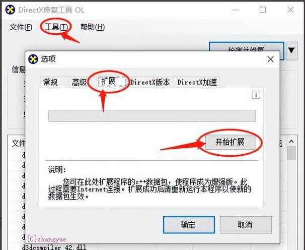 2、如果没有看到弹出同时更新c++的提示的话,需要点击菜单栏中的工具,然后选择选项,再点击扩展,点击下方的开始扩展,这个操作可以将c++更新到程序当中,以进行后面的操作。