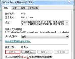 7、双击进入“DHCP Client”,看看此服务是否为启动状态,如果没有点击启动,应用。此项就可能为造成系统无法获取IP地址的关键。