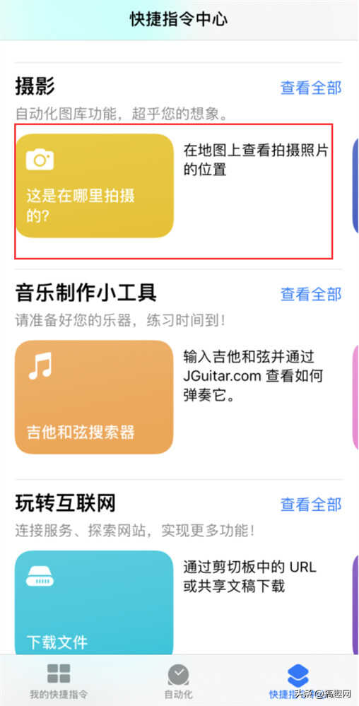 2.点击“快捷指令中心”标签页,在“摄影”栏中找到“这是在哪里拍摄的”快捷指令,点击之后选择“添加快捷指令”。