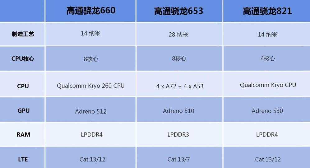 高通骁龙660采用14纳米工艺,8核心Kryo 260 架构CPU,Adreno 512 GPU,搭载骁龙 X12 LTE调制解调器,支持Cat.13/12,峰值下载速率为600Mbps,是前作骁龙653的两倍。骁龙660在硬件规格上十分给力,没有多少明显短板,整个芯片性能十分均衡。