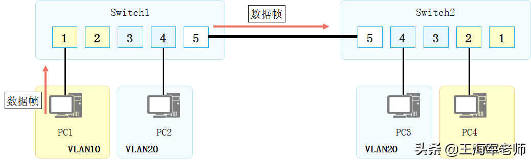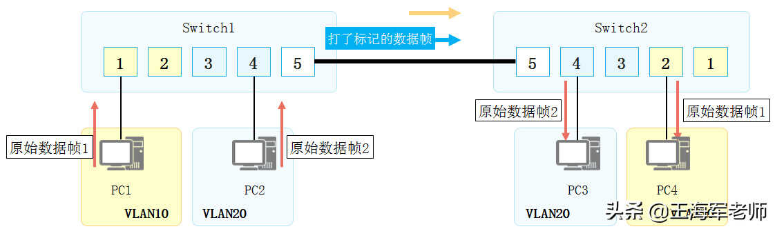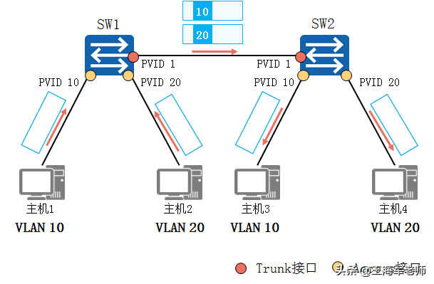 •PC1发出的数据经过Switch1和Switch2之间的链路到达了Switch2。如果不加处理,后者无法判断该数据所属的VLAN,也不知道应该将这个数据输出到本地哪个VLAN中。