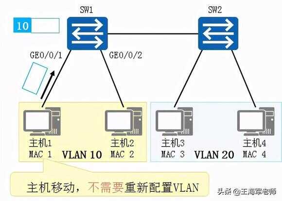 ▫当计算机接入交换机的端口发生了变化时,该计算机发送的帧的VLAN归属不会发生变化(因为计算机的MAC地址没有变)。