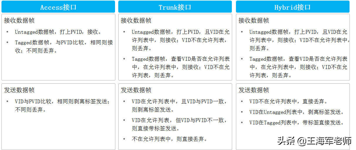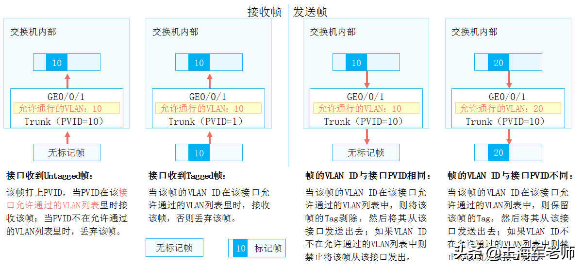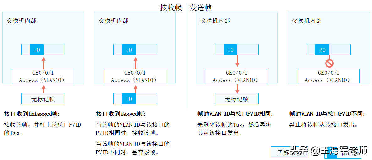 •上文已经介绍了交换机如何识别数据帧属于哪个VLAN以及VLAN的划分方式,那交换机对于Untagged帧和Tagged帧又是如何处理的呢?