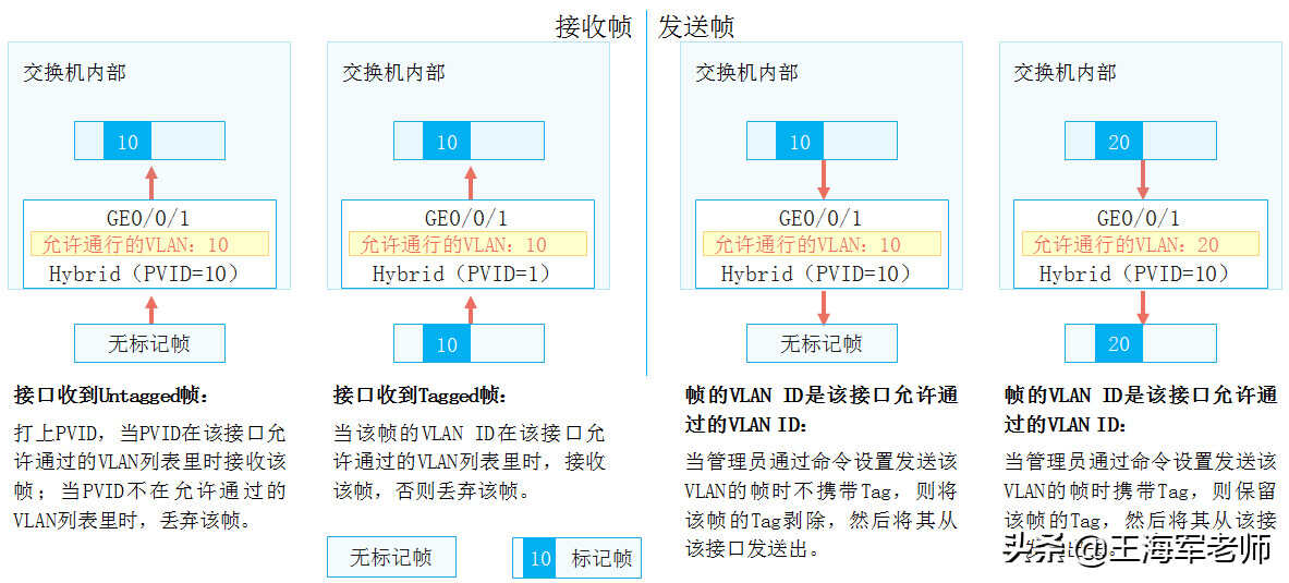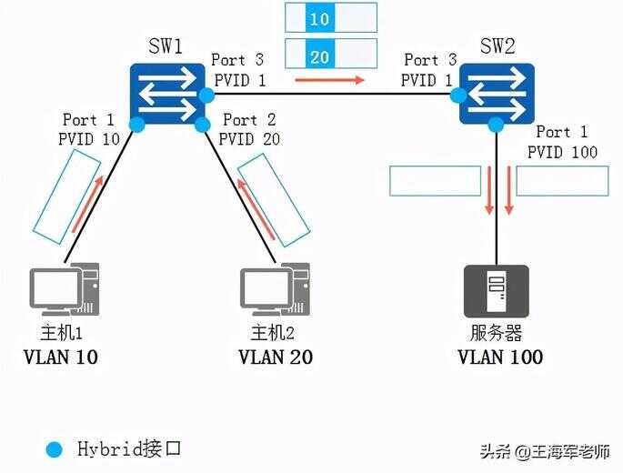 Hybrid接口与Trunk接口类似,也允许多个VLAN的数据帧通过,这些数据帧通过802.1Q Tag实现区分。用户可以灵活指定Hybrid接口在发送某个(或某些)VLAN的数据帧时是否携带Tag。
