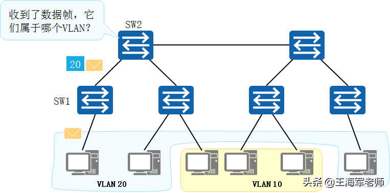 •如图所示,SW1识别出某个帧是属于哪个VLAN后,会在这个帧的特定位置上添加一个标签。这个标签明确地标明了这个帧是属于哪个VLAN的。其他交换机(如SW2)收到这个带标签的数据帧后,就能轻而易举地直接根据标签信息识别出这个帧属于哪个VLAN。