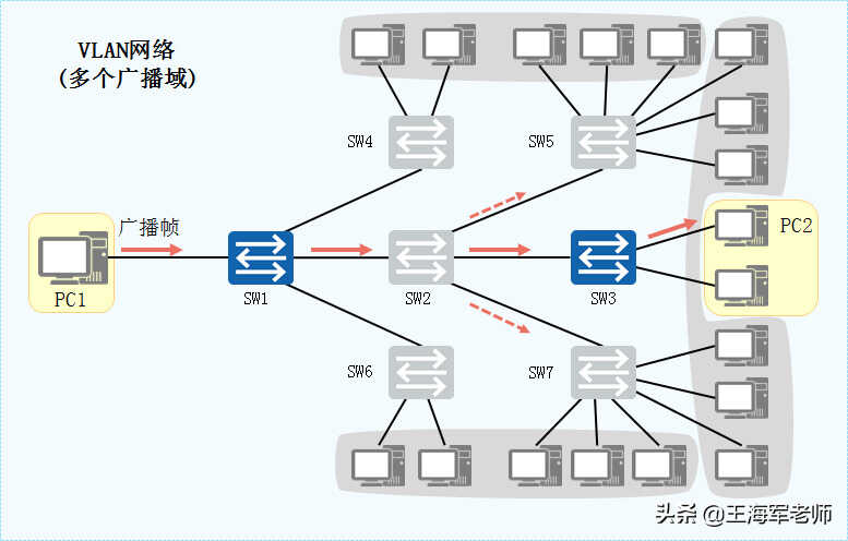 •在典型交换网络中,当某台主机发送一个广播帧或未知单播帧时,该数据帧会被泛洪,甚至传递到整个广播域。