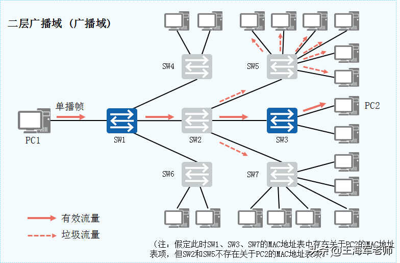 ▫如图:如果PC1向PC2发送了一个单播帧。此时SW1、SW3、SW7的MAC地址表中存在关于PC2的MAC地址表项,但SW2和SW5不存在关于PC2的MAC地址表项。那么,SW1和SW3将对该单播帧执行点对点的转发操作,SW7将对该单播帧执行丢弃操作,SW2和SW5将对该单播帧执行泛洪操作。最后的结果是,PC2虽然收到了该单播帧,但网络中的很多其他非目的主机,同样收到了不该接收的数据帧。