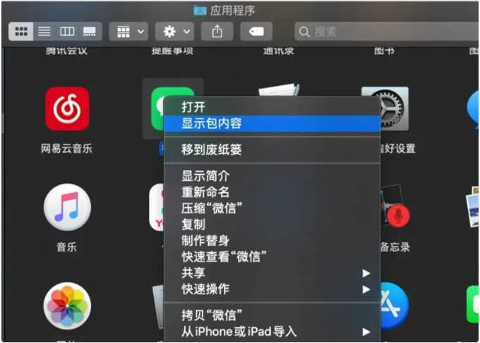 打开【应用程序】账号,找到【微信】并按下鼠标右键,选择【显示包内容】,然后依次点击【contents】-【MasOS】,使用鼠标右键按下【WeChat】,然后选择【制作替身】就可以了。