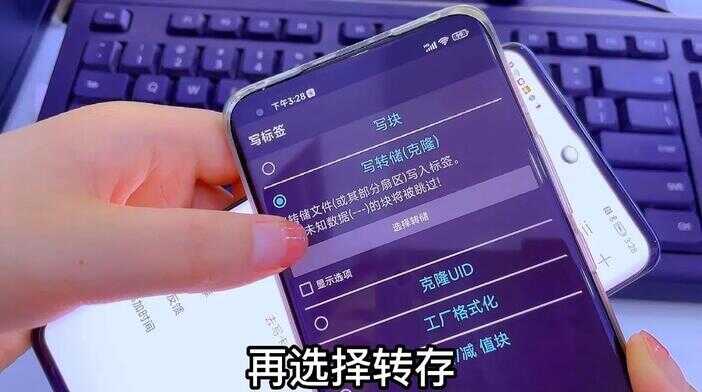然后把刚刚建好的这个空白卡的手机放到这个另一部手机NFC的感应区,放好之后我们点击选择携转存克隆选项,在选择转存,然后再点击下面的选择转存这个扇区,所有的信息我们都勾选,然后我们点一下OK,