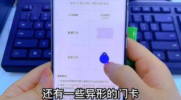 这时我们可以拿出事先准备好的门禁卡,根据它的提示,把这个模拟的实体门禁卡贴在我们手机的背部的NFC的感应区,那这个NFC的感应区呢,一般都是在我们手机背面的上部,那在这里还可以查看支持门卡的范围,我们点击一下就能够看到这种门卡的样式,普通门卡,还有一些异型的门槛,它都是支持的,