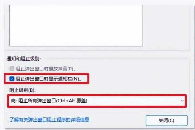 3、勾选 阻止弹出窗口时显示通知栏 将阻止级别改为 高:阻止所有弹窗 点击 确定 重启电脑。