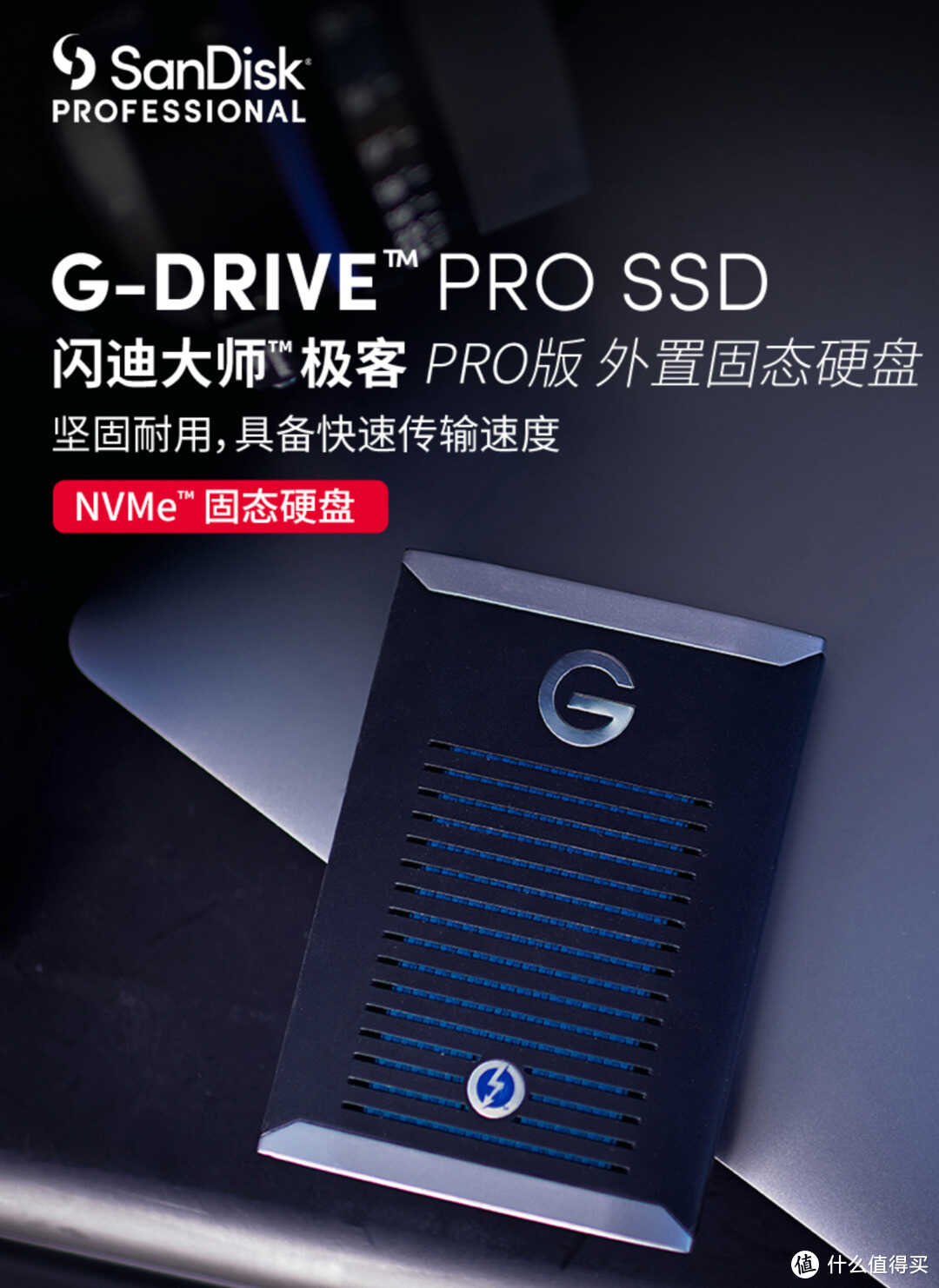 ▲闪迪大师的英文名为SanDisk Professional,从名字便知道其是一个专业级的产品,从G-Drive Pro的闪电标识可清楚的得知,其是一款走雷电3通道的顶级PSSD。
