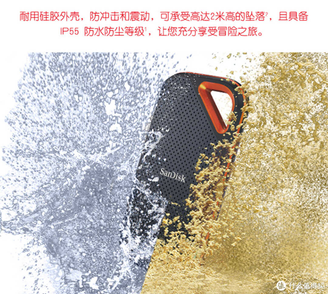 ▲其橡胶外壳可以有效吸收冲击力,使闪迪E81可承受2米坠落并具有IP55的防水防尘等级。