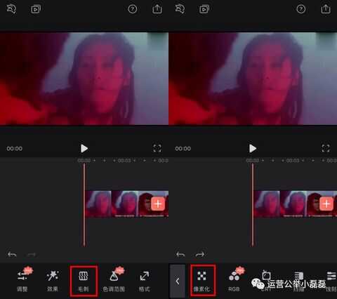 接着在视频下方出现一排较为齐全的功能,选择“毛刺”里的“像素化”,也就是我们俗称的马赛克。