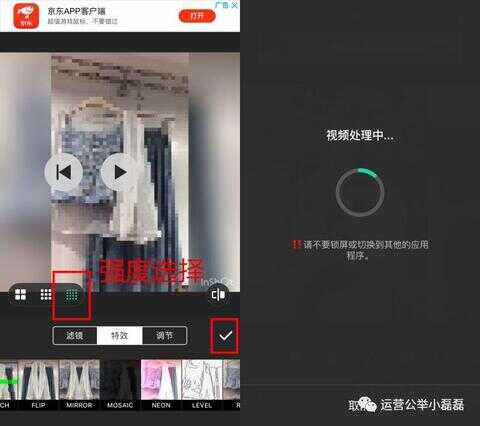 点击特效栏目下的马赛克标志,视频里会直接带上马赛克效果。还可自定义选择马赛克的强度,一切设定好后点击保存按钮,视频会自动转码保存到相册里。