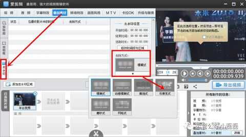 点击页面最上方的“叠加素材”,选择下面的“去水印”选项框,然后在右边的模糊选项里选择“马赛克样式”。
