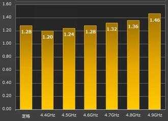 温度表现和CPU电压的运行趋势图看出,手动4.4G降电压后温度和默频持平,这个算是个小窍门吧。然后,随着电压陆续0.4V的提升,温度也呈现了递增,其中4.8G到4.9G的温度变化最大,所以我们建议还是将I7 6700K超频至4.8G比较为妥。