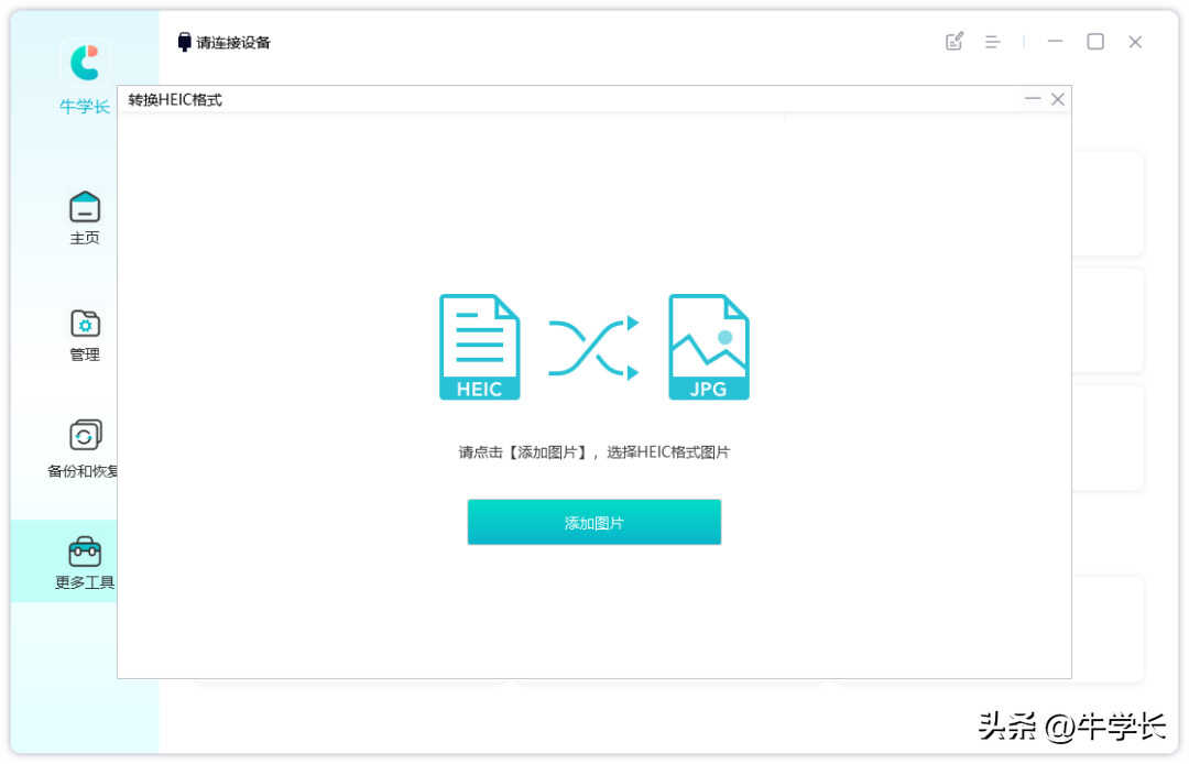 第1步:安装启动牛学长工具,直接选择软件界面的“更多工具”功能区,再选择“转换HEIC格式”,然后就可以选择添加想要转换的HEIC格式图片。(工具可在评论区获取)