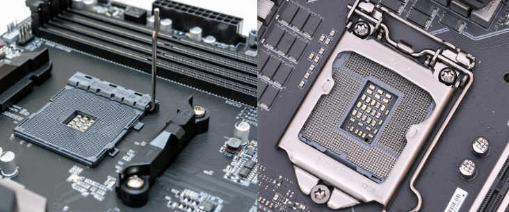 至于它们两个的区别,从外观上大致也可以看出。比如AMD平台的CPU插槽是没有顶盖的,而Intel平台的CPU插槽是有顶盖的。