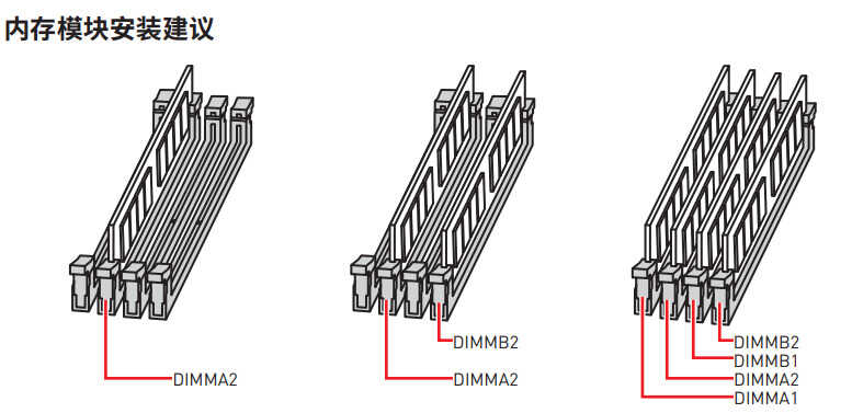 至于如果是4条内存的话,就直接把4个插槽插满即可。但是,对某些高端用户来说,2条双通道的内存更利于内存超频(所以一般不会把4条内存都插满)。