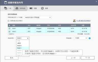在识别了希捷酷狼Pro硬盘后,我们需要建立存储池,打造能够多人实时在线数据互传的云空间,在存储与快照总管页面,直接创建存储池,选择可用磁盘,2块20TB的希捷酷狼Pro硬盘已经被自动识别和列装,我们将两块磁盘全部勾选后,系统会自动推荐存储池建立类型,这里一共有三种可以推荐,分别是JBOD/RAID 0/RAID 1,熟悉存储的朋友都清楚,为了防止数据的丢失,和安全稳定的备份,我们一般选择RAID 1模式,该模式下两个磁盘互相镜像和备份,当真正出现单个磁盘数据丢失时,另一个磁盘还能有完整的数据备份,这也是目前双磁盘最具性价比和实际价值的部署方式。