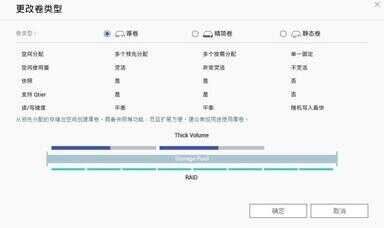 完成存储池创立后,还需要为RAID设置卷的类型,不同卷在空间使用,性能表现方面存在一些差异,我们可以按需设定,如果没有突出需求,直接点击默认的“厚卷”点击创立,进入配置页面选择磁盘区卷容量等客制化设置后,点击完成即可实现所有存储池的建立。