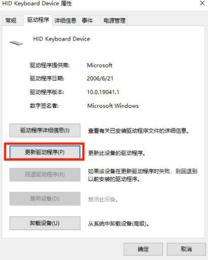 3、在属性窗口中我们选择驱动程序,接着点击更新驱动程序,我们把键盘驱动更新一下去排查这个问题。