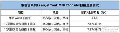 扫描方面,使用惠普创系列2606sdw打印机的ADF单元进行连续扫描,在150dpi、灰色、文档模式下,实测扫描速度为21.0页/分钟;在300dpi、灰色、文档模式下,实测扫描速度为17.6页/分钟。