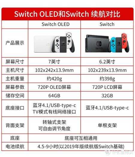 Switch 新版在初代的基础上,更换了全新的芯片,大大增加了续航时间,提升到了 4.5~9小时。 (初版只有 2.5~6.5 小时)。