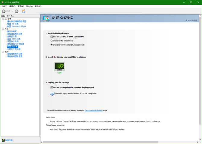 第一项是G-Sync功能的开关,下面的子选项可以选择让G-Sync只在全屏模式下启动,或者在全屏及窗口模式下都启动。第二项是系统自动检测到的用户显示器型号,如果同时连接了多个显示器,我们需要手动选择一下开启G-Sync的设备。第三项是为当前已选择的显示器开启G-Sync功能,如果用户使用的是非官方认证的显示器,会有额外的兼容性提示,可能会出现画面模糊或卡顿等情况。