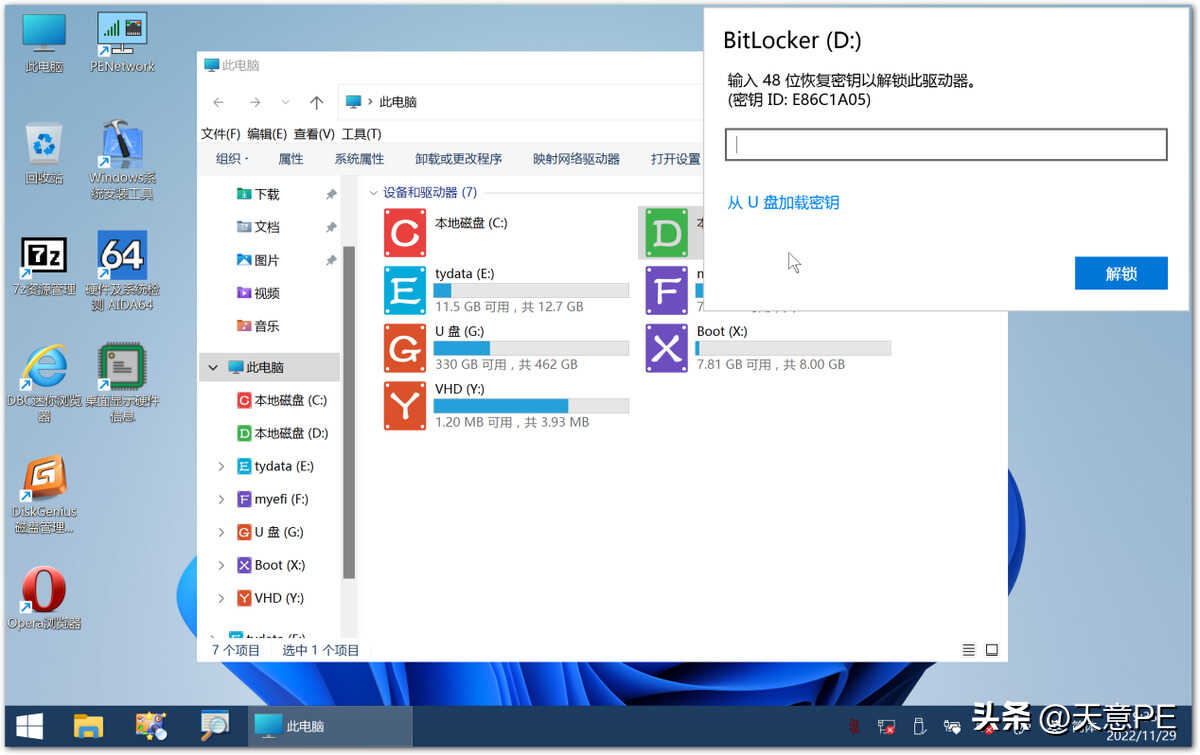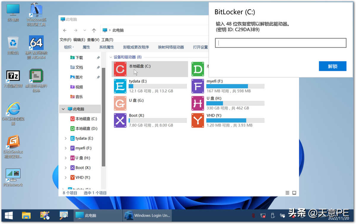 BitLocker加密保护了数据的安全。但是也带来了一个小问题,就是当我们用WinPE维护电脑的时候稍有不方便。每次打开磁盘都需要输入恢复密钥,一大堆数字,稍不注意输错了还得重新再来。