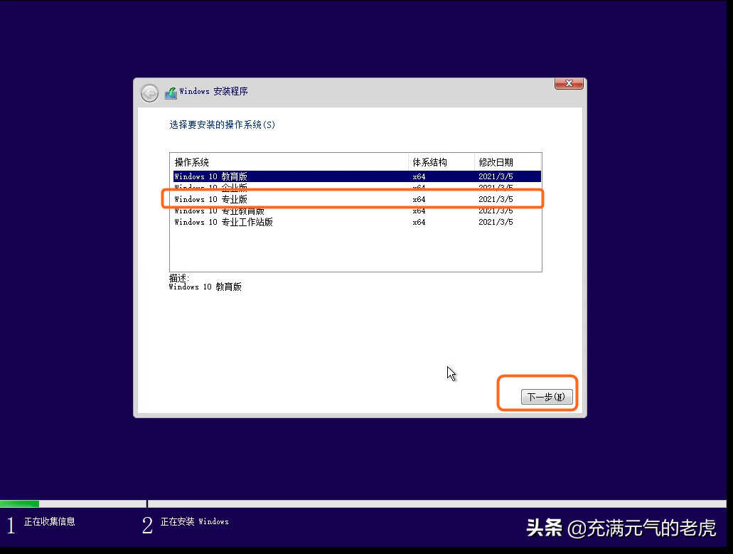 第十步:windows10源文件里包含多个版本,这里选择专业版。
