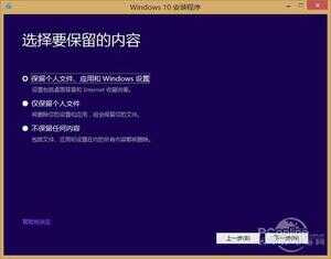 选择第一项会保留win8.1下与win10相兼容的配置项,也就是说安装后旧系统的配置全部都还保留。第二项是只保留个人文件,既配置信息会被删除。第三项则是全部删除(由于本教程没具体实测是删除C盘还是全盘,如非空盘或有意想清除全部内容,否则请慎重选择此项,有可能导致您的文件丢失。)