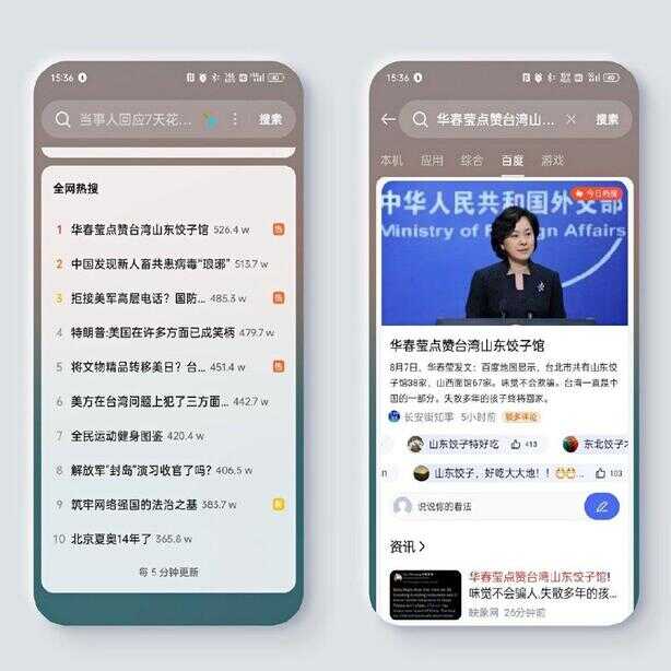 全局搜索的主页主要由4个部分组成,顶部的搜索栏、下方的搜索历史、应用建议和全网热搜。