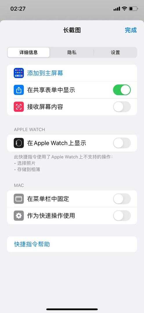 这样子我们整个操作就已经完成了,然后点击这个右上角蓝色几条杠,一定要把在共享表单中显示打开,这样你才能在相册中找到设置好的这个快捷指令操作。