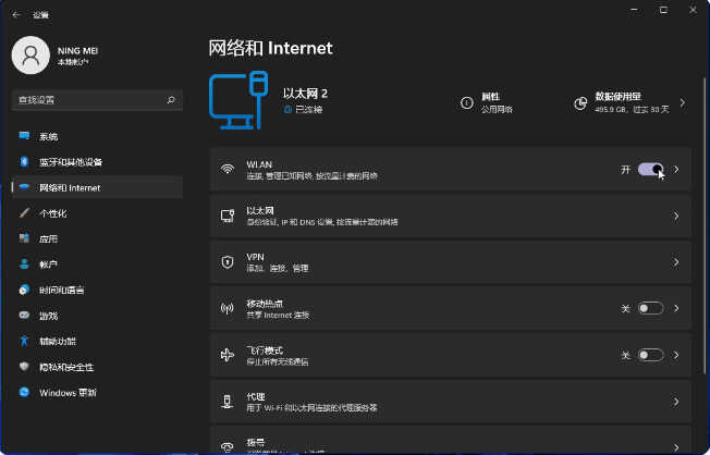 3、接着参照上面的步骤进入系统设置,点击网络和internet,开启WLAN旁边的开关,打开无线网络连接。
