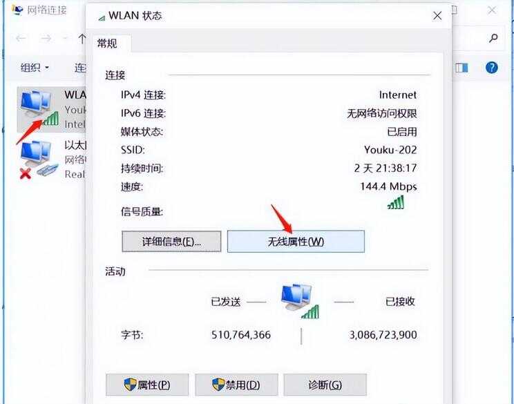 4.双击连接的无线wlan,在弹出的wlan状态对话框中,点击无线属性,如下图所示