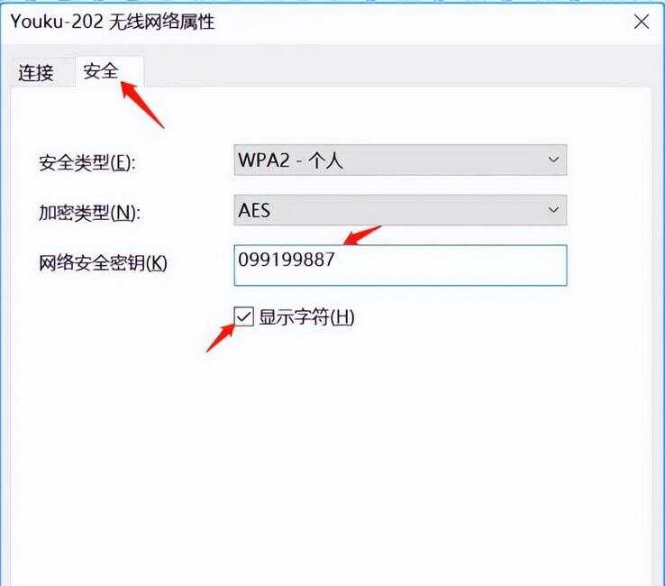 5.在无线网络属性对话框中,选择安全选项,勾选显示字符复选框,即可查看到电脑wifi密码!
