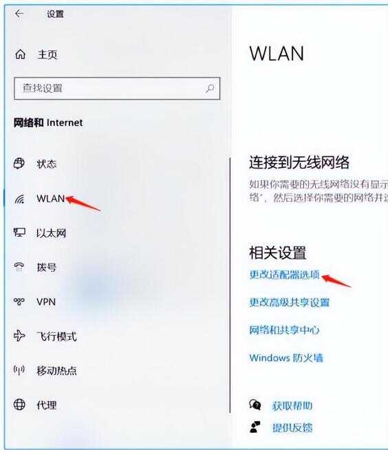3.点击左侧wlan,选择右侧更改适配器选项,如下图所示: