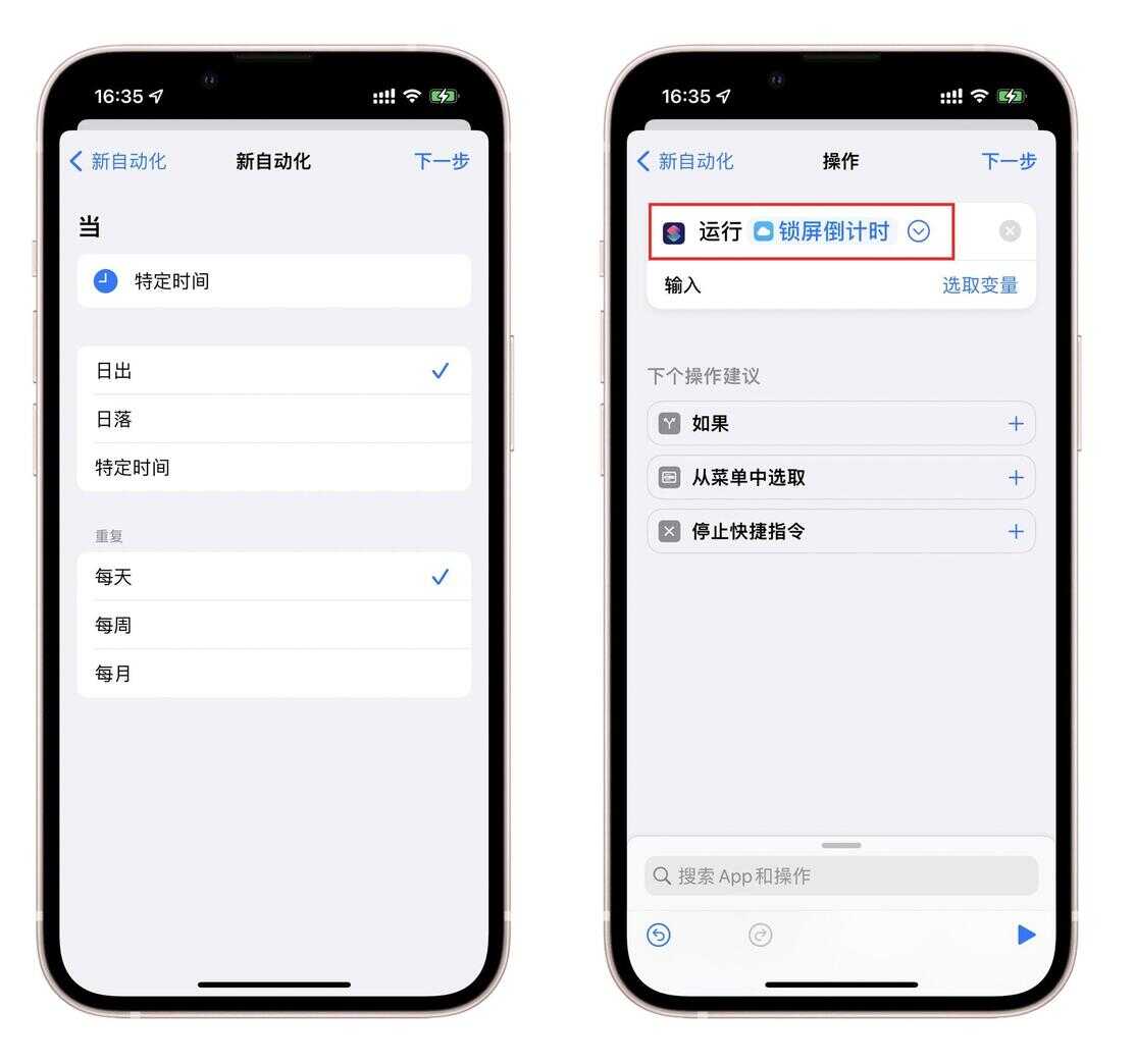 而iPhone利用快捷指令就可以直接在锁屏界面下看到倒计时或者天气之类的信息,并且可以利用自动化功能实现每天更新。