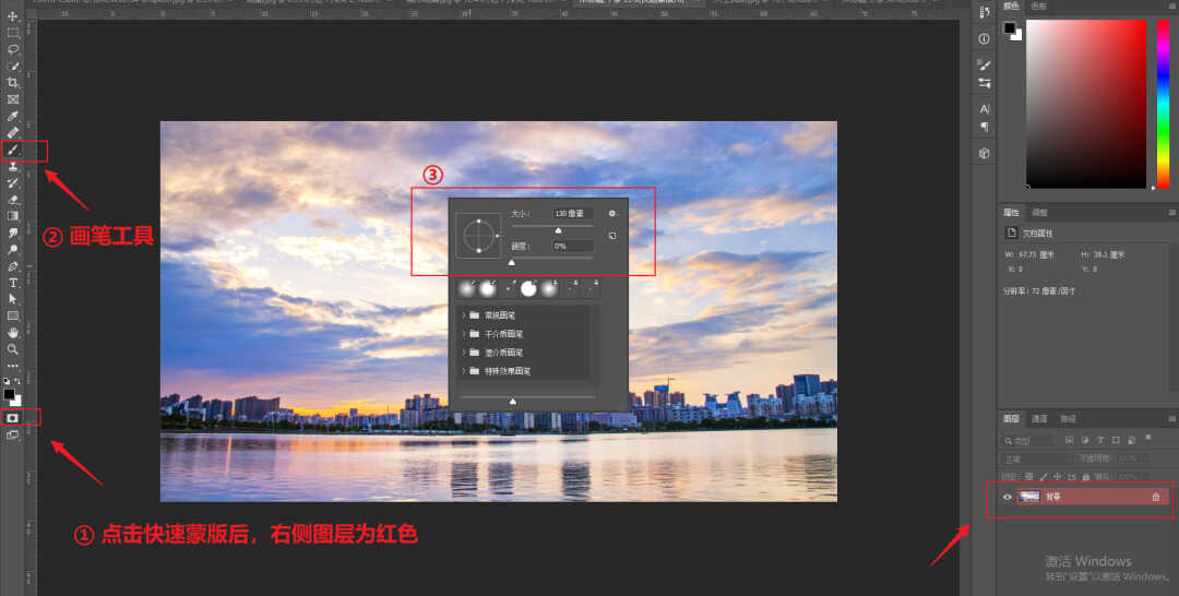 接下来点击左侧工具栏倒数第二的图标「以快速蒙版工具编辑」,然后选择画笔,设置硬度为0。