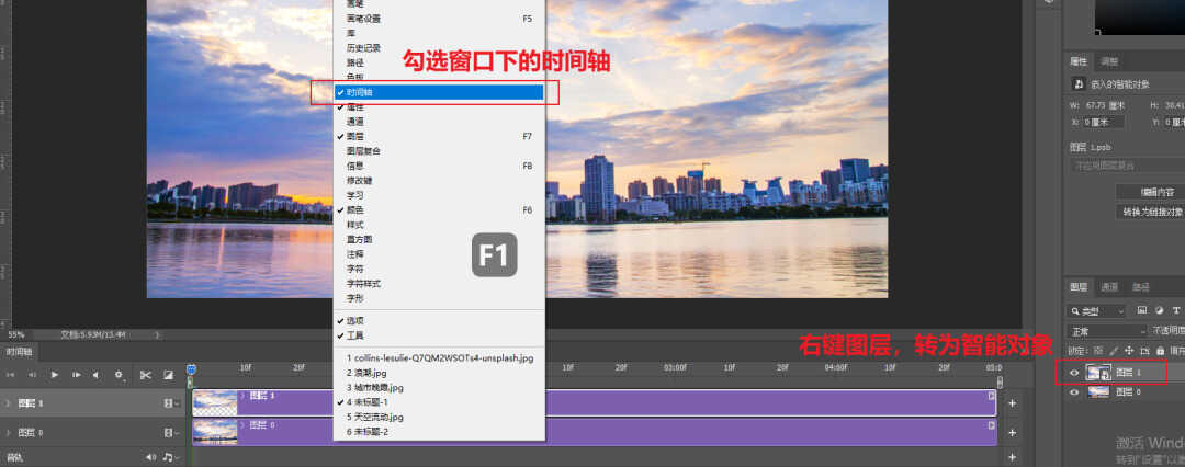打开窗口下的时间轴,点击弹窗中的「点击创建时间轴」。然后右键刚复制的图层,选择「转为智能对象」。