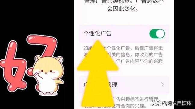 注意看下方有一个“个性化广告管理”,我们把它点开,下方有一个“个性化广告”,后边的按钮是绿色的,是默认打开的状态,因此我们要把它点一下变成灰色,那么就把这个个性化广告关闭了,这样就会减少广告跟踪,你学会了吗?赶快来试一下吧!