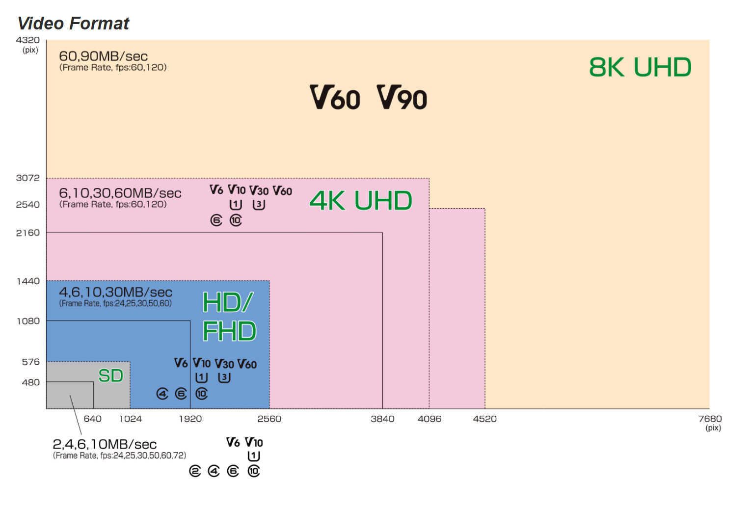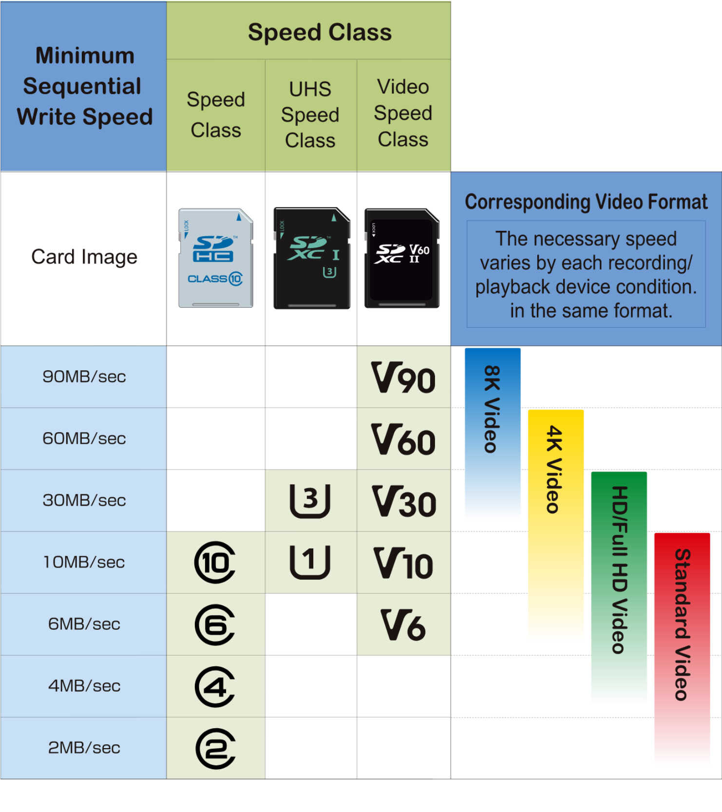 说到了录制视频,我们再来深入研究下录制视频对内存卡写入速度等级要求: