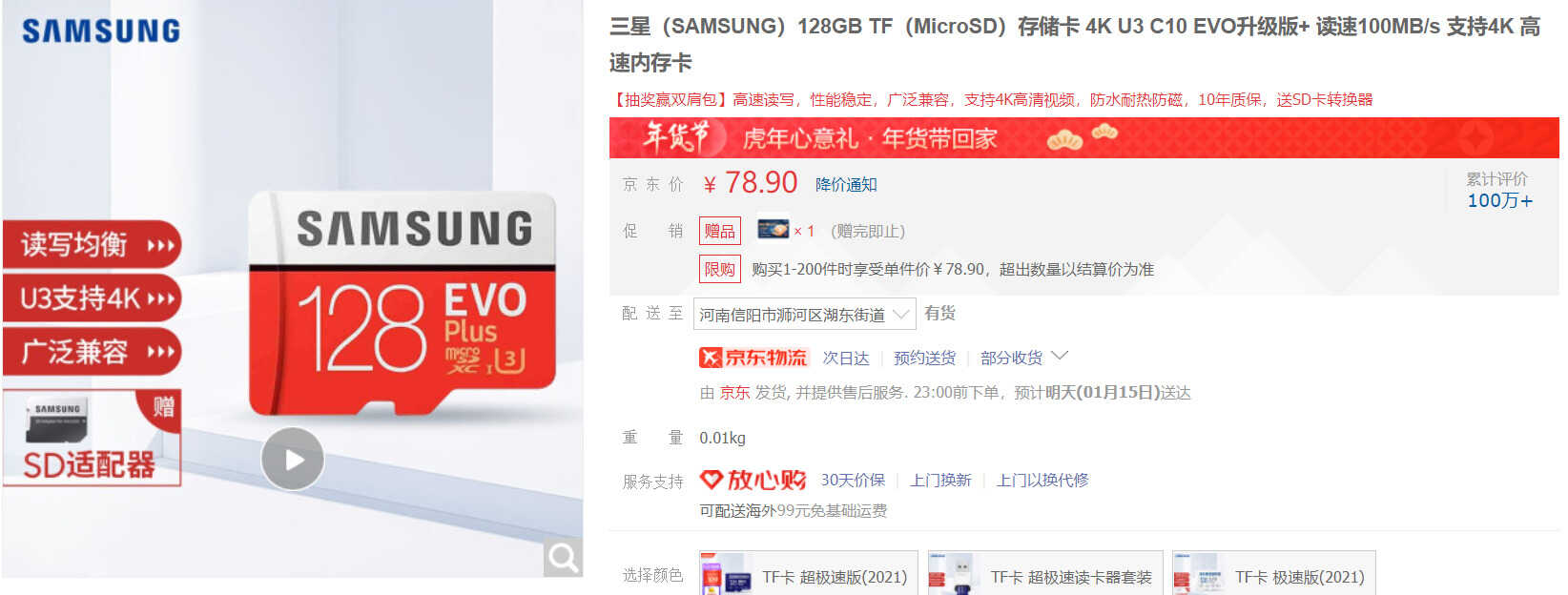 ▲入门级TF卡这里推一款三星的红卡,这款卡还有一个姊妹版的黄卡,目前价格也是差不多,不过只有红卡标注了写入速度为60MB/s,且网上的实测也说红卡比黄卡要快一些,所以这里所以这里就推红卡不推黄卡了。