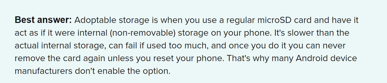 ▲简单总结翻译一下Adoptable Storage的概念,就是安卓手机是可以将应用安装在内存卡中的技术。需要注意的是,内存卡要用好的,否则持续读写容易搞坏,且开机时取出内存卡必须重置手机,必须重置手机,必须重置手机,重要的事情必须说三遍。