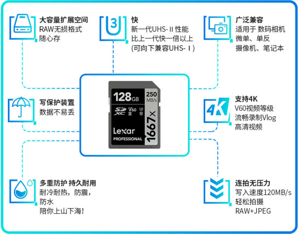 ▲当然,如果录制视频频率比较高,需要经常向电脑上拷贝视频文件的话,那么读取速度就显得更重要了,雷克沙UHS-Ⅱ标准的1667X Pro拥有着250MB/s的读取速度以及120MB/s的写入速度,可以节约大量的复制文件时间。