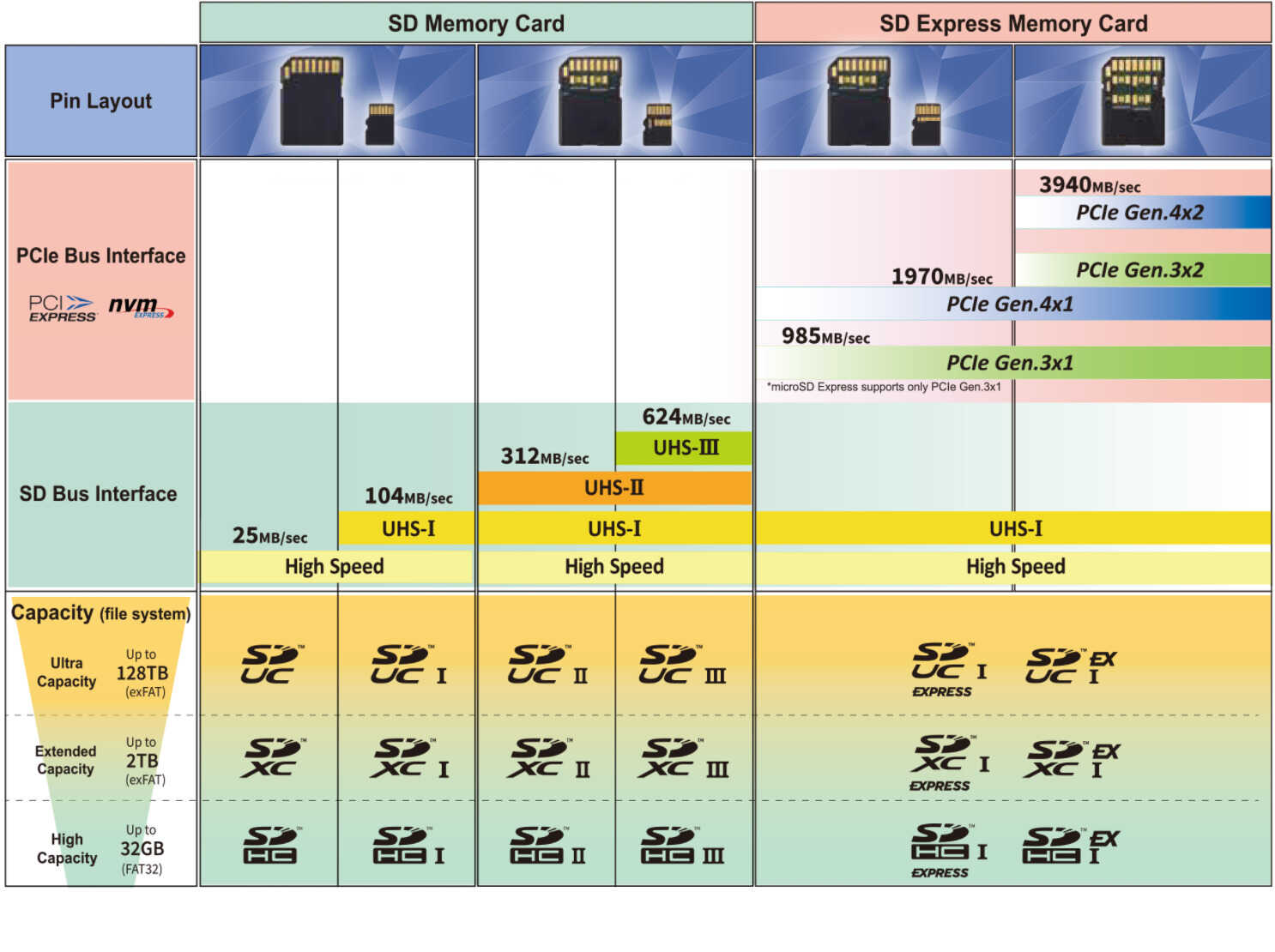 ▲另外,不同的记忆卡类型所使用的总线频率也不同,大家可以看这张图。从SDHC开始,就已经支持UHS-Ⅰ以及更高级的UHS-Ⅱ,UHS-Ⅲ总线界面了,支持UHS-Ⅲ规范的内存卡速度可达624MB/s,速度已经超过SATA3接口的SSD了,而新发布的,走PCIe总线的SD Express标准,速度最高可达3940MB/s,已经达到M.2 SSD的速度,当然,目前为止别提SD Express标准的卡片,就连UHS-Ⅲ规范都还只存在于理论之中。