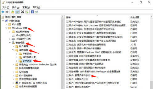 2、接着这一步,在左侧栏目中选择windows设置-安全设置-本地策略-安全选项,然后在右边能看到“账户:管理员状态”的选项。